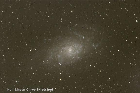 Here we will continue to work with the image of M33 that has had a non-linear curve stretch applied, and that has been white balanced in Photoshop from the previous sections.