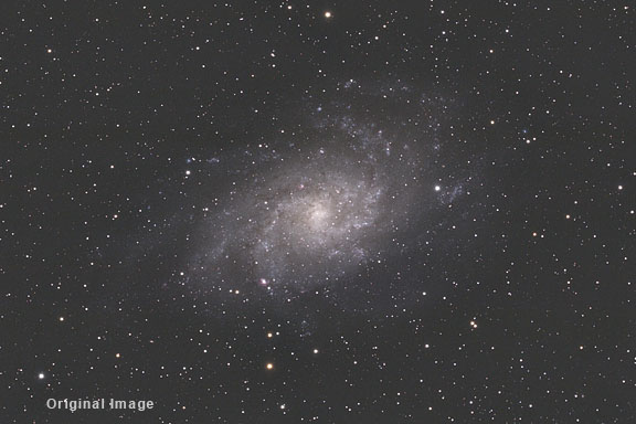 2. While monitoring the pixel values in the info palette, drag the black point in the Levels dialog in the combined RGB channel to the right until it matches the aim point you have decided on. In this example, our aim point is 30,30,30. You should not make the sky completely black at 0,0,0. Depending on the image, something in the range of 15,15,15 to 30,30,30 is good. It is better to err on leaving more room than necessary here since the image is being worked on in high bit depth, the black point can be adjusted again later if necessary, but once data is clipped, it cannot be replaced. The Sky is Not Black! Most people perceive the night sky as being black, but it is not. Even at the darkest observing sites on the planet, the sky is not seen as completely black, but rather dark gray once our eyes are completely dark adapted. It is only gray to our perception because the level of illumination is not enough to stimulate the rod cells in our eyes which are sensitive to color. The dark night sky actually has color. Digital cameras are sensitive enough to record the color of the night sky in long exposures, just as they are capable of recording detail and color in deep-sky objects that we cannot see visually. The color of the dark night sky color comes from airglow, interplanetary dust particles reflecting sunlight, starlight scattered in the atmosphere, and the stars in our galaxy. It is a dark red - brown color. Light pollution can also significantly contribute to color in the sky that gets recorded and may make the sky more red, or even green, depending on the type of light illumination causing the light pollution. Because inexperienced astrophotographers expect the sky background to be black, they will keep their exposures short to make it so. This is a bad idea because longer exposures are needed to fight photon noise. Short exposures also put detail from the object down in the noise of the camera. Some astrophotographers will expose the original images correctly, but then over adjust the sky background in an image processing program to make it black. When this is done, faint detail will be lost. Many people have their monitors incorrectly adjusted so that dark detail is lost. Printers also usually have difficulty with this kind of shadow detail.
