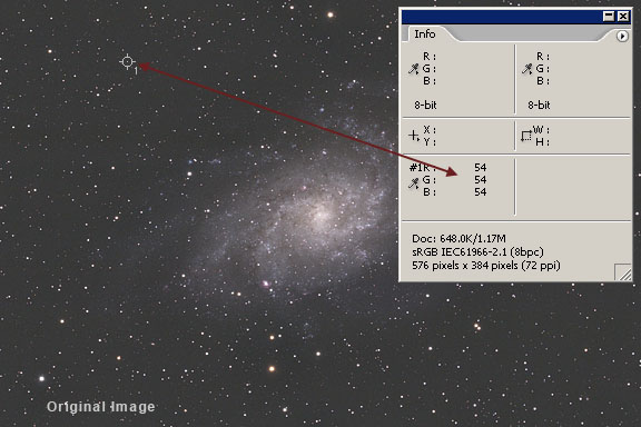 Video After neutralizing the color of the sky background, we may need to adjust the black point of the image if the tonal values of the blank sky background are too high. If your image is overexposed, and the sky background under the color sample point reads high, for example, anything more than about 50,50,50 after neutralization, then you will need to adjust the black point. For this section we will continue to use our example image of M33 that we have been working on. After neutralizing the sky background, the brightness of the sky background is too high at about 54,54,54. We will now adjust the black point of the image to correct this and make the sky background darker. Adjust the Black Point in Levels 1. Establish a color sample point with a 5x5 pixel box in a blank area of sky background. Go to Image > Adjustments > Levels.