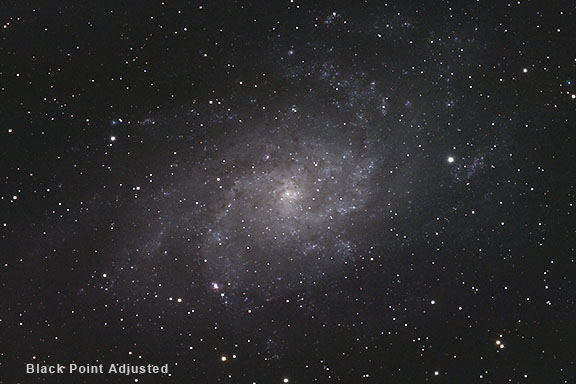 Generally, we can start out adjusting an image in order from the top to the bottom. Since there are 5 controls that affect the tonality and one that affects the color, there are many different combinations that can be tried. I usually set the amount to between 25 and 50 percent, depending on the image. For this image of M33, we will set it to 35 percent. Setting the Tonal Width slider to zero makes the adjustment affect only the darkest parts of the image. Setting it to 100 percent makes it affect the shadow and midtone areas of the image. Leave the Tonal Width slider to 50 percent. Leave the Radius set to 30 pixels for this image. Finally, set the black clipping point at 0.5. Be careful to monitor the histograms as we don't want to clip any significant shadow detail. Since we have started with the sky background around 30,30,30 and it has been lightened with the Shadow/Highlight command, we can bring it down a bit here with the black clipping point to get back to where we want it around 30,30,03. Note that these settings are not applicable to every image. Each image should be adjusted individually based on the image's content and the user's goals. Shadows and midtones can also be lightened with a mid-tone adjustment in Curves, and their contrast increased in Levels, but you run more of a chance of blowing out significant highlight detail. Careful use of these commands however, can also produce excellent results. |