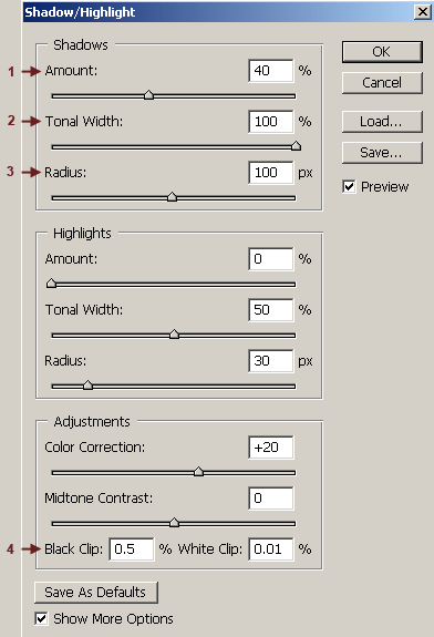 Video Ok, there really aren't any "shadows" in a deep-sky astronomical image. The term "shadow" comes from normal daytime photography where the darkest areas of an image were usually located in areas that were in shadow from the main light source. This term has carried over in astrophotography to mean dark, low-brightness detail just above the sky background. This dark shadow detail usually needs to be brightened to make it more visible. If the entire image is brightened then detail is usually lost in the highlight areas. To prevent this, the highlights can be masked and just the shadow areas lightened. In the old days before Photoshop CS, we had to make a mask and enhance the shadow areas manually. But, thanks to the miracles of modern technology and programming, we can now do this automatically with Photoshop's Shadows and Highlights filter. Open the working image of M33 and go to Image > Adjustments > Shadow/Highlight. Check the "Show More Options" box.