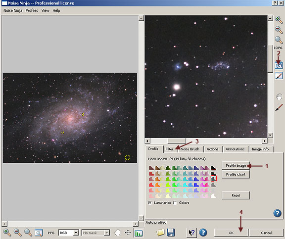 Video Depending on how many photons were gathered in the stacked image, and how well calibration was performed, your working image at this point may have a lot of noise, or it may be relatively noise free. After stretching and enhancement, noise in the original image is aggravated. This noise, usually most visible in the blank sky background of the image, can be controlled and reduced through the use of software filtering. For noise reduction there are many options, such as Photoshop's Smart Blur filter, Photoshop CS2's new Reduce Noise filter for digital cameras, Neat Image, Grain Surgery, and many more. The solution I use is Picture Code's Noise Ninja. It works on high bit-depth images in a stand-alone application or as a Photoshop plug-in. Noise Ninja works very well at reducing noise. Perhaps too well. These noise reduction programs sometimes have a bit of a problem in distinguishing extremely fine high-frequency detail in an image from noise because they look virtually identical. Consequently, sometimes real detail gets removed, such as faint stars. We can control this in the filter by