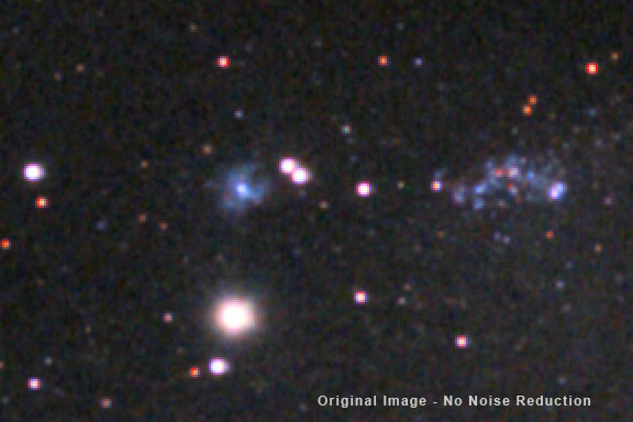 Noise Ninja will now apply the filter to only the shadow areas of the image because of the layer mask. If blotchy color noise is not a problem in the image, you can reduce the Filter Strength for Chroma Channels (the top slider) under the color section of the Filter Tab in Noise Ninja. Experiment with different blending modes and opacity percentages for the layer with the Noise Ninja filter. Shift-click on the layer mask to turn it off (a big red X will appear in the thumbnail image of the Layer Mask in the Layers Palette when it is off). After you have found a result that is optimum, you can save the image as a .PSD Photoshop file to preserve the layers and masks, or if you are sure of the result, you can flatten the image (Layer > Flatten Image) and save it as a .TIFF file. Flattening the image merges all of the layers together into a single image. The noise in the original image is not too bad. The worst noise is the dark noise in the blank sky background. Full noise reduction with Noise Ninja is excellent, but some faint stars and star clouds have also been reduced, possibly too much. Using Lighten as the blending mode when the filter is faded is probably the best compromise between noise reduction and detail preservation. The difference is subtle, but the dark noise has been reduced and faint stars and star clouds have been preserved. It should be noted that it is very easy to apply too much noise reduction. The image will then look plastic. Noted astrophotographer Chuck Vaughn has pointed out that the human visual system is used to seeing detail down to the limits of its resolution. If an image has all of its noise and fine detail removed, it will not look natural. The secret of noise reduction is to find that point in the process where noise is reduced as much as possible while still retaining all of the real fine detail in the image. This happens at the point where the scale or frequency of the noise blends in a the same frequency as the real detail in the image. This point is generally arrived at by a trial and error method mediated by experience. |