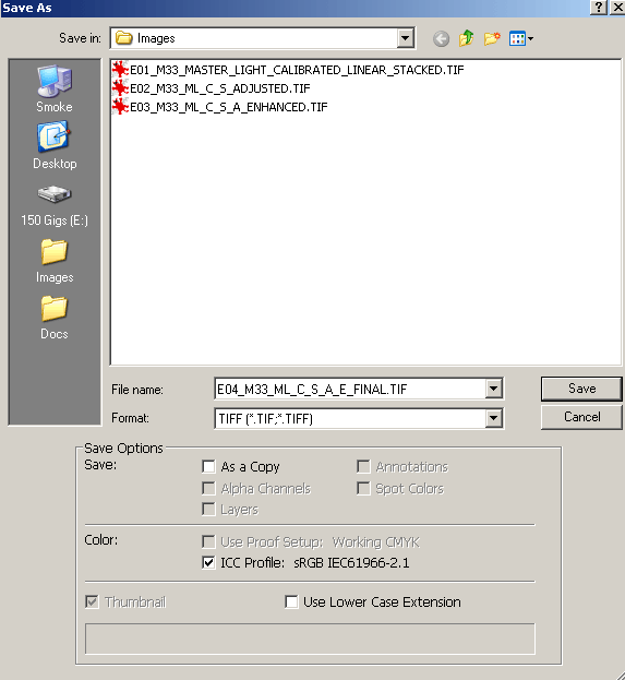 Video Save the adjusted image as uncompressed TIFF file. Give it a new file name and do not overwrite the original. In this case, the file naming convention uses an abbreviated letter for each of the processing steps that the image has undergone. Also, a numerical prefix is added so the images are listed in order of processing. This makes it a little easier to keep track of what has been done to the working images. I usually save a 16-bit uncompressed TIFF image file of each of the processing steps. This way, if I want to go back and try a different processing procedure, I can start at any step. An alternative is to save the file as a Photoshop format file (.psd) with the adjustments, such as levels, or curves, saved as adjustment layers. In this particular example here is the file name used: E04_M33_ML_C_S_A_E_FINAL.TIF. Here are what the abbreviations in the file name stand for:
