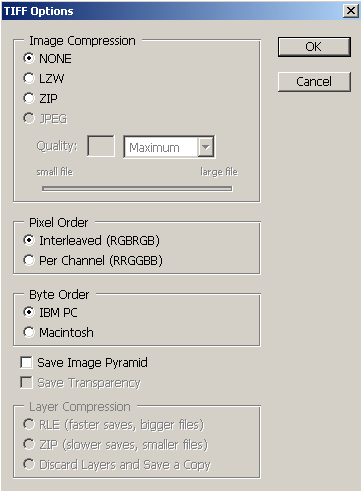 If TIFF is selected, chose None for Image Compression, Interleaved for Pixel Order, and IBM PC for Byte Order. Do not check on Save Image Pyramid.