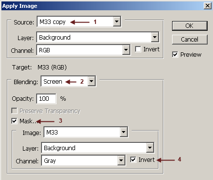 Video SMI stands for "Screen, Mask, Invert". It is a technique that I have developed to reduce noise and enhance faint parts of the image without blowing out the stars. It uses a blurred copy of the image and Photoshop's Apply Image dialog. The best thing about the SMI technique is that it does not require multiple original images, or a separate luminance image to be combined, all you need is a single color original image. This technique uses a blurred copy of the original image. The blurred copy is combined with the original in Apply Image with the blending mode set to Screen, and Mask and Invert are checked for the target image. SMI Procedure