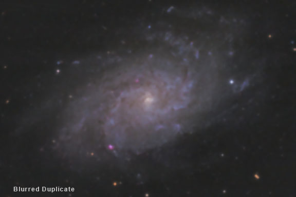 After applying the SMI enhancement, you will need to re-set the black point of the image to about 30,30,30. In the SMI enhanced image, faint detail is brightened and at the same time grain is reduced while the star sizes stay the same. A similar brightening of the faint detail could be produced with a simple curves adjustment of the original image, but at the cost of making the grain appear worse as well as enlarging the star sizes. The only downside is that the contrast in the dark lanes in the core of the galaxy has been reduced. We will fix this in the next section with a highpass filtered, softlight blended layer. |