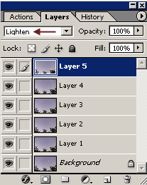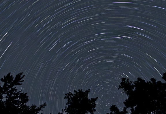 Through the magic of digital imaging, we can composite as many short sub-exposures together as we would like to equal a longer exposure. We even get the added advantage of being able to shoot star trails at light-polluted locations because the sky will not fog in these shorter exposures. Shoot a series of individual exposures, each several minutes long, and paste them all as layers on top of each other in Photoshop. The trick is simple. Change the blending mode for each layer to "lighten". Then the sky will be contributed from only the background layer, and only the stars will be added from each of the other layers. Set up your camera on a fixed tripod and make sure it does not move in between exposures. Use all of the same techniques that we discussed here earlier. You can use freeware programs like Startrails, by Achim Schaller, or StarMax, by Gilbert Grillot and Sylvain Weiller, to combine your exposures. These programs were specifically designed to create star trail images. |