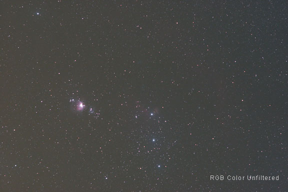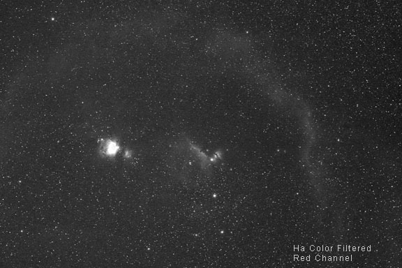 Channel substitution takes a separate higher contrast image, or a different wave band, usually taken with a filter, and blends it into a color image, or substitutes it for one of the channels in a color image, to produce a hybrid that has the best features of both. In the example above, a black and white image from the red channel of a hydrogen-alpha filtered image has been substituted into the red channel of a normal RGB color image. This greatly enhances the visibility of the red hydrogen-alpha nebulosity in the image. In the days of film, a high contrast black and white technical pan film image would be combined with a lower resolution color image. When CCDs came along, this method was called LRGB (the L stood for Luminance). An unfiltered high-resolution luminance image is combined with lower resolution red, green and blue color images to save time in producing a color image. Today many CCD imagers are using narrow-band filters to accentuate different wavelengths in objects, such as hydrogen-alpha, SII, and OIII. These wavelengths are recorded in the color image, but when shot with a filter in a separate image, and then combined with the color data, they are much more prominent. The same process can be done with DSLR cameras, but with some caveats. Narrow-band filtered images produced with CCD cameras take advantage of the high-sensitivity of the CCD chip to these wavelengths, and utilize the complete resolution of the chip. DSLR cameras, on the other hand, have the Bayer filters over each pixel. In a Bayer array, one half of the pixels have green filters, and only one quarter are red, and one quarter blue. This means that for a hydrogen-alpha filtered image, only one quarter of the total pixels in the chip will record the data of interest. There are many different ways to blend filtered images into color images. For example, a high-contrast black and white image from the red channel of a hydrogen-alpha filtered image can be substituted for the red channel in an RGB color image, as seen in the example above. Or, it can be pasted as a layer and combined using different blending modes in Photoshop. The remarkable difference in the amount of hydrogen-alpha emission nebulosity recorded in the image taken with the filter can be seen compared to the unfiltered image in the images above. This is because the filter removes all of the light of the spectrum below red. That filters out all of the light pollution, of which there was some at this moderately dark-sky observing site, and allows longer exposures to record more nebulosity. Because the sky is darker, there is also more contrast between the nebulosity and the sky background. Naturally, this filter will not do a very good job of recording broad-band objects such as galaxies or reflection nebulae which contain light across the entire spectrum. This particular hydrogen-alpha filter was a cut-off filter made by Lumicon for use with film, but nevertheless, it works with CCDs and DSLRs also. A cut-off filter means that it cuts off all of the spectrum below a particular wavelength. Other narrow-band filters cut off more of the spectrum, on both sides of the wavelength of interest. For example, a narrow-band hydrogen-alpha filter may only pass a window of 15nm worth of wavelengths centered on 656.3nm, the wavelength of hydrogen alpha. Even more narrow filters are made, but are really more suitable for CCD work because they require really long exposures. Red Channel Substitution Copy the red channel from the hydrogen-alpha filtered image and paste it into the red channel of the unfiltered image.
