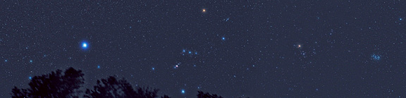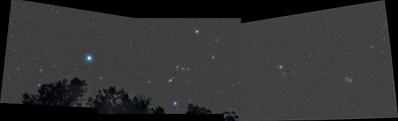 The constellations of Canis Major (the Big Dog), Orion (the Hunter), and Taurus (the Bull) stretch across the winter sky just before the start of dawn in this three picture mosaic composite.