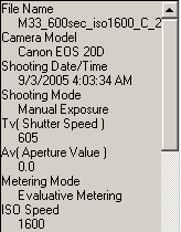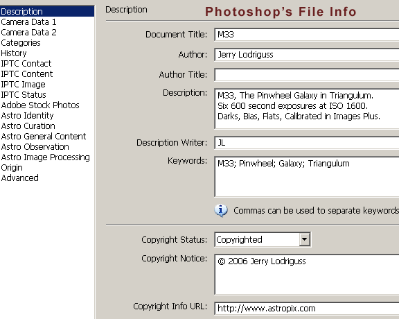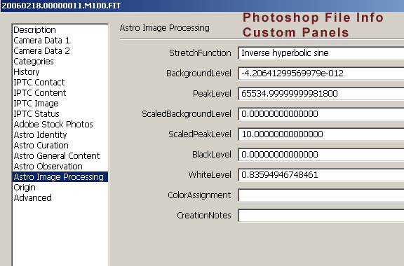 Photoshop CS2 also offers the ability to create custom metadata panels in File Info. Adobe uses XMP (eXtensible Metadata Platform), a version of XML (eXtensible Markup Language), to support metadata formats. In the example seen above, FITS Liberator has created custom metadata information panels that are displayed in Photoshop CS2's File Info dialog. These panels contain data about the settings used in FITS liberator when an original FITS file is converted and a hyperbolic arcsine stretch applied (as we did to the image of M33 in the section on Advanced Image Processing of Raw Images - Non-Linear Stretch). Adobe's website has information about the implementation of metadata and XMP explained in detail as well as information about creating custom File Info panels. Not all file formats support the embedding of metadata. TIFF (Tagged Image File Format) and JPEG (Joint Photographic Experts Group) formats do, as well as Photoshop's native .PSD format. Image Information Some possible information that can be recorded and stored as metadata in an image file: