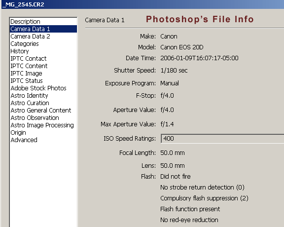 This is just one of the multiple parts of Photoshop's File Info dialog. It displays some of the most pertinent EXIF data in an image file, but not all of it. Photoshop's File Info, however, allows you to add your own metadata information into the file under Description and all of the other categories except advanced. Adobe has implemented even more extensive and powerful metadata tools in Photoshop CS2. In the File Browser it is possible to add metadata to multiple files at once. Ian Lyons has a tutorial on File Browser and how to do this at the Computer Darkroom web site.