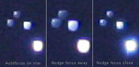 Note that the stars in the image above were taken from near the center of the field. Although it looks like coma, it is not. These aberrations, a bright stellar point surrounded by an off-centered halo, were present on all stars in the field, in the same orientation. The image at far left was focused with the Canon autofocus system at f/2.8 on the bright star Capella. The autofocus system did not have any apparent problem focusing on the star. The middle image had the focus tweaked manually just the smallest amount that I could physically move the focusing ring, past the infinity mark. The image at far right had the focus tweaked manually just the smallest amount that I could physically move the focusing ring, to the close focus side of the infinity mark. These different focuses were tested in case the lens did not autofocus exactly at infinity. It can be seen that the best apparent focus is in the first frame where the lens was autofocused. It has the tightest stars. The other two frames show that best focus is not on either side of the autofocus point. When I initially examined the stellar images from this lens visually with a high-power, high-end eyepiece, and they were awful. When the image was in the best focus I could obtain (smallest star size), they had a giant halo around them that was off-centered. I originally attributed this to some slop in the eyepiece holder that I had rigged up, thinking the eyepiece was not orthogonal to the optical axis. But I found exactly the same aberrations in the stars in the images I made with the 1D MarkII, as can be seen in the images above. I realize that these camera lenses were designed for daytime terrestrial photography and not astrophotography of point sources across the entire field. Even using ED and Fluorite glasses I would not expect the color correction to be perfect on a point source, especially given the speed of the optical system in these super telephotos. However, I have considerable experience with these types of lenses for astronomical imaging on film, and haven't seen these kinds of gross aberrations before. Initially I thought the halos might have something to do with the low pass filter in front of the CMOS sensor in the camera, but I don't see them on shots taken with the telescope. And that also would not explain why the halos are off center. That is what I really don't understand. Quite honestly, I don't know what is going on. I don't know if it's the IS elements possibly being tilted slightly or what. The fact that these aberrations were not present in the images taken through the apochromatic refractor indicate that the problem is in the lens and not in the camera or sensor. |