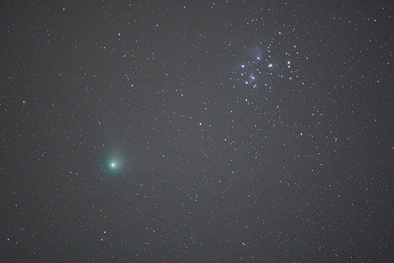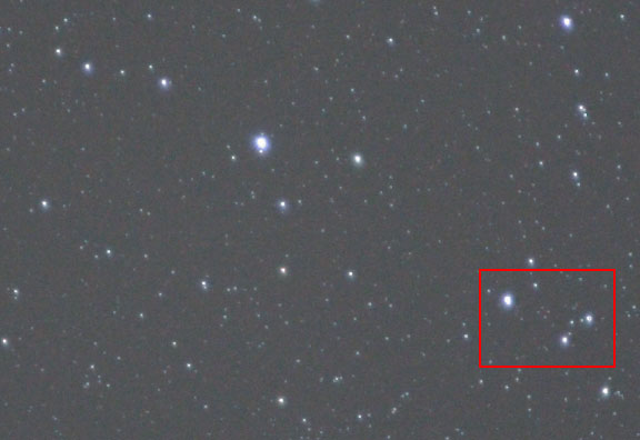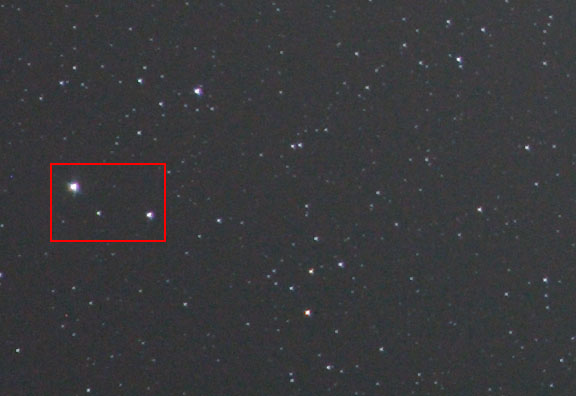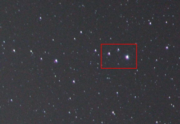 The Image was opened in Photoshop CS and the mid-tone gamma was adjusted to 3.18. No other adjustments were made to the image. For display on this web page, the images were re-sized using bi-cubic resampling, sharpened with an unsharp mask of 100 percent, a radius of 0.5 pixels and a threshold of 0. The files were then converted to sRGB color space and saved with a JPEG quality of 8. The original high-resolution file was opened in Photoshop where it was enlarged to 100 percent and cropped for the following examples of the lens' performance on a star field.