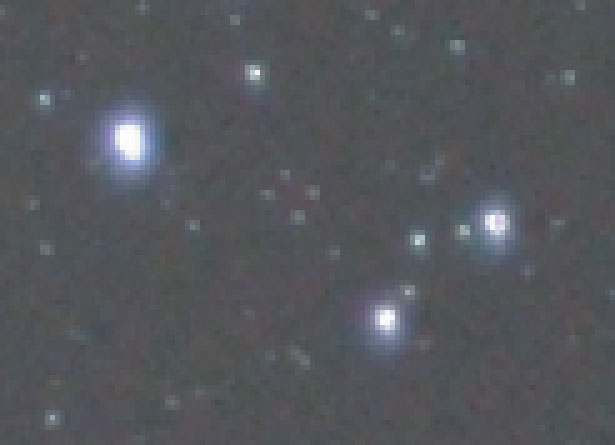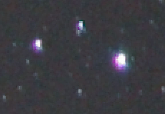 Also note that the stars are not circular in Image 3, which they should be, and as seen in the previous examples shot with the 300mm f/2.8 and 400mm f/2.8 L series USM IS lenses, the brightest core of the star is not centered, but offset to one corner, with a large diffuse halo around it, that is not chromatic aberration. These particular stars were chosen very near the exact center of the frame. because they display a varied range of brightness.