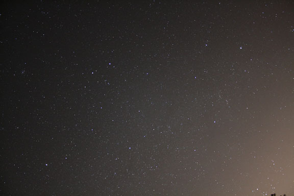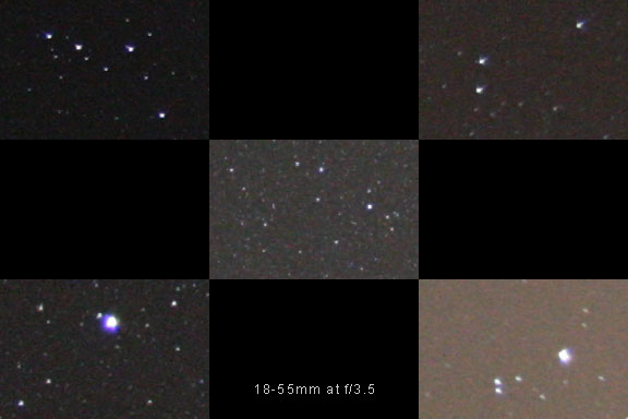 This is a test of the Canon EF-S 18-55mm f/3.5-5.6 IS Autofocus Zoom Lens on a star field. This is a very inexpensive lens that comes in a kit with the Canon Digital Rebel cameras and costs about $140 if purchased separately. Gemini is near the center of the frame, and the Hyades is in the lower right corner. This is the full frame image at 18mm of focal length, the lens' widest setting. These images are taken from the in-camera JPEG, with in-camera sharpening turned off. The camera was set to a custom white balance, and no color correction or other enhancements were applied. All images were manually focused with Live View on a bright star. Note that this zoom lens is not parfocal. This means that it must be re-focused if you change the zoom setting. Below are the corners and center of the frame seen at 100 percent enlargement: In the comparison above, we can see the performance in the center and corners of the lens wide open at f/3.5 at 18mm of focal length, and stopped down one stop to f/5.0. Performance of this lens is very good when used wide open at f/3.5 at 18mm focal length. There is a bit of chromatic aberration seen as blue fringing around the brightest blue stars, and a bit of coma and astigmatism in the corners, but neither is objectionable. Chromatic aberration improves considerably when the lens is stopped down one stop to f/5.0, but the coma and astigmatism only improves a little bit. Stars also get a bit tighter and sharper, as is expected, when the lens is stopped down. In general, almost all lenses improve in performance when stopped down a stop or two from wide open. It is hard to see in the full-frame image at the top of the page, but there is also some vignetting present in the frame shot wide-open at f/3.5. Almost all lenses have some vignetting when used wide open, so this is nothing out of the ordinary with this lens. Vignetting improves as the lens is stopped down, but it is certainly not objectionable wide open. In the comparison above at 500 percent enlargement, we can see the chromatic aberration near the center of the lens wide open at f/3.5 at 18mm of focal length, and stopped down one stop to f/5.0. This color fringing improves as the lens is stopped down, but it is only visible around the brightest blue stars in the frame. I shot other similar tests with the lens at 35mm of focal length, and zoomed all the way in at 55mm of focal length, with similar results, except the lens performance improved wide open at the longer focal lengths, although the f/ratio did get slower as the lens is zoomed in. Conclusion This lens' price - performance ratio is outstanding. It is certainly usable wide open at its fastest f/ratio and widest zoom setting for astrophotography with very good results. It is also very good at its other focal lengths when used wide open. The lens is even usable wide open at f/3.5 at its widest angle of 18mm for constellation shots on a fixed tripod at ISO 1600 with about 30 to 45 second exposures. For longer focal lengths, because the lens gets slower as it is zoomed in, star trailing be become more noticeable sooner on a fixed tripod. For use on a polar-aligned equatorial mount, a fast aperture is not as much of a consideration for most wide-field shots, since a longer exposure can be used, and tracking is not that critical at the focal length range covered by this lens. At its widest setting, the Canon 18-55 f/3.5-5.6 EF-S IS zoom lens is only 2/3 of a stop slower than Canon's top-of-the line 16-35mm f/2.8 EF L USM IS zoom, and at a comparable aperture of f/3.5, it's performance is remarkably similar. The 18-55mm costs $140, and the 16 - 35mm costs about 10 times as much at more than $1,400. Here you can see a star-field test of the 16-35mm f/2.8 lens. Of course, the 16-35mm is made to cover a full frame sensor and the 18-55 is only made to cover the smaller APS-sized sensors, so it can't be used on a full-frame camera. But if you can afford a full-frame camera, you can afford the more expensive lens. The other difference is that the 16-35mm stays at f/2.8 throughout the zoom range, but, all things considered, the Canon 18-55 f/3.5-5.6 EF-S IS zoom lens is a remarkable bargain, especially considering it has Image Stabilization built-in for daytime photography. Exposure Data