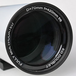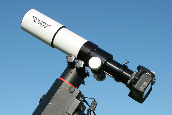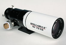 The Stellarvue SV70ED Travelhawk is a doublet refractor this is available from Stellarvue for $399. It has an aperture of 70mm, a focal length of 420mm and a focal ratio of f/6. The doublet is hand figured, and made from extra-low dispersion (ED) glass. The SV70ED comes with a Vixen-style dovetail mounting foot that also is threaded for a 1/4 - 20 bolt for use on a standard tripod. A small metal foam-padded carrying case is included in the price. The scope weighs 4.5 pounds and is 12 inches long with the dewcap retracted. This evaluation was done with an SV70ED that was purchased directly from Stellarvue. Fit and Finish