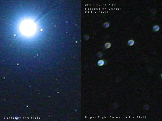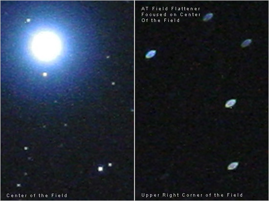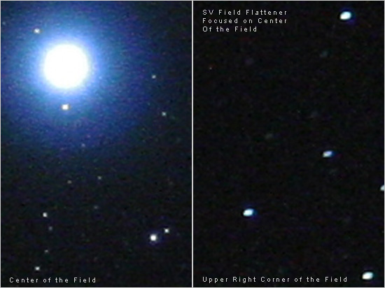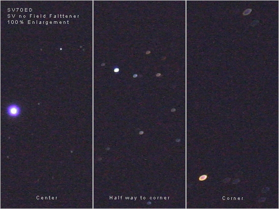 As with many telescopes, the field of the SV70ED is not flat. This is not a problem visually. Photographically, stars in the corners are grossly out of focus unless a field flattener is used. In these photographic tests with an APS-sized DSLR, the Stellarvue field flattener worked the best and improved the size of the stars in the corners of the frame, although these stars still were not perfectly focused. In practical use in the real world, this will hardly be noticeable. The visual star test, and long-exposure astrophotography of star fields are two incredibly demanding tests of an optical system. They reveal every flaw, and very few telescopes are flawless. Camera lenses are even worse (see this test of Nikon's 400mm f/5.6 ED lens). Examining these tests at 200 percent magnification is also an extremely critical test. In the real world, you are hardly ever going to look at stars at even 100 percent magnification. The Bottom Line Considering the price of the scope, I would rate its photographic performance as a very good match for a beginner astrophotographer and I would recommend it as a great bargain. It must, however, be used with a field flattener for astrophotography. It is also a nice little carry-anywhere scope that can be used on a tripod for wide-field visual use. Ratings