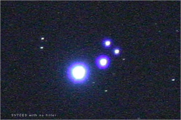 The fit and finish of the SV70ED is excellent. It has a beautiful white powdercoat finish and screw-in lens cap with the SV logo on it. The dewshield is built in and slides back on the optical tube for storage. The rotating 2-inch Crayford focuser is excellent and one of the best that I have used on a small refractor. The dovetail mounting foot is made of relatively soft aluminum however, and indentations form when it is locked down into the dovetail by the two locking bolts in my Orion Sirius mount. These don't affect the use of the scope in any way, but they do mar the physical appearance of the foot. The scope doesn't quite balance perfectly in dec when a camera is attached, but it's not out of balance enough to be a problem with any kind of decent mount. The focuser rotates radially so that the focusing knobs cab be located at a more convenient position, or so that a camera's orientation can be changed once it has been focused and the focuser locked down. The focuser rotates by means of three nylon-tipped set screws that fit into a groove machined into the focuser. A thumbscrew locks down the focuser so it can't rotate, but this thumbscrew is not nylon tipped, and if tightened too much it will leave a gouge in the groove. I don't particularly like rotating focusers so I just tightened the three nylon-tipped screws down so the focuser won't rotate at all and removed the locking thumbscrew completely. If I need to re-orient the camera, I simply unlock the 2-inch adapter, rotate it, and lock it down again. When the scope was delivered, one of the nylon tips was broken off on one of the three screws, but this was quickly replaced by Stellarvue at no charge. Visual Performance I tested the SV70ED with a 32mm Plössl, 18mm Nagler Radian, 11mm Nagler and 7mm Nagler on several different nights. These eyepieces provide 13x, 23x, 38x, and 60x magnification. I also used a 1.4x Dakin Barlow with some of them. I observed one night from my driveway in suburban Philadelphia, with a naked eye limiting magnitude of about magnitude 4, on a night with a large bright gibbous moon. I was just able to detect M57, the Ring nebula at 13x magnification. At 60x, it was easily visible because of its high surface brightness. Epsilon Lyra, the Double Double, near Vega, was a nice tight little pair with each clearly elongated into a figure-eight shape at 60x. On an earlier night, the Trapezium in Orion was very easily separated with all four of the brightest stars cleanly visible, and hints of the E star visible sometimes. I could not detect the sixth star (F) that night, but this may have been more due to the seeing than the scope's performance. I also observed M13, the great globular cluster in Hercules, which was not quite resolved across the core at 60x, and the double star Albireo, which was a beautiful blue and gold. The Star Test The star test was performed using the scope without a diagonal to eliminate any possibility of the diagonal introducing any problems. Star testing the SV70ED on Arcturus and Vega, the scope produced an Airy disk with little color that was noticeable visually. Racking the focus at high power from outside of focus to inside of focus, the typical Fresnel ring pattern was visible outside of focus with the outer ring being brighter than the other rings. At focus, the Airy disk displayed a classic diffraction pattern with the first ring being a little large and a little on the bright side. Inside of focus, the Airy disc stayed a small spot as an out-of-focus hazy shell grew around it as focus was racked in. The Fresnel rings formed farther out, but the spot did not appear to be perfectly centered on the haze. Way inside and way outside of focus, the rings were not the same. Inside of focus, the outer ring was more fuzzy and bigger, and inner rings was larger also, compared to the rings outside of focus. In a perfect optical system, the Fresnel rings inside and outside of focus would be identical. However, identical patterns are rarely found even in excellent refractors, and I don't get them in my Astro-Physics 130EDT triplet apochromatic refractor. Inside of focus, as the focus was moved more inwards, the airy disk stayed the same size as the haze got bigger until the air disk finally blossomed out to the rings at about 1/4 turn of the fine focus knob. The inside-focus characteristics of a tight core surrounded by a hazy glow is indicative of spherical aberration. At low and medium powers, the SV70ED provided very nice views and tight stars. However, fine detail on Saturn's rings started to fall apart at high power due to the spherical aberration. Photographic Performance - Color Fringing Although the SV70ED has little color visually, it does have some blue/purple fringing around bright stars that is recorded photographically with a DSLR camera. This color fringing can be improved considerably by the use of a minus violet filter, but this will add $80 to $100 to the cost of the scope. If you regularly use something like Hutech's LPS filter, it will also remove this color fringing and you won't need to use a minus-violet filter. Below you can see the SV70ED's color performance on bright stars in M45, the Pleiades, one of the toughest objects for this kind of test. Click your mouse cursor in the image below to see a comparison of the color fringing with and without a minus violet filter. In Comparison 1, we can see that the use of the Lumicon minus violet filter greatly improves the blue/purple fringing around bright stars and reduces the size of the star diameters but causes a larger but fainter blue halo around the brightest stars. Photographic Performance - Field Flatness Like most telescopes, the SV70ED has a curved focal plane due to simple geometry. This is not noticeable when the scope is used visually with an eyepiece, but it is a problem for astrophotography of star fields. With this scope for astrophotography, stars become unacceptably out of focus about 1/2 of the way from the 