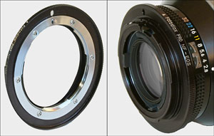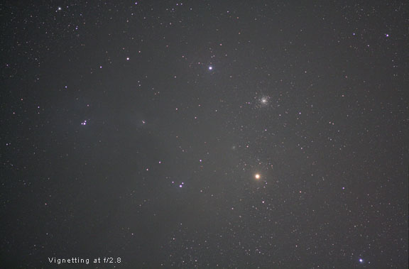 The latest version of the Nikkor 180mm f/2.8D AF ED-IF Autofocus Lens has internal focus. Most of the body of the lens is fixed and does not move as the lens is focused manually with the focus ring. This version of the lens can be mounted with the rings in a variety of positions - pretty much anywhere except for on the focusing ring. However, on the old manual focus Nikkor 180mm AI-S ED lens that is tested here, the entire lens barrel moves when the focus ring is turned. This is a difficult complication. It is not trivial to mount this lens. There is really only one very thin metal collar with grooves in it between the focusing ring and beveled area that you can anchor it by, which can be seen in the image above. The front set of lock downs can't be tightened until the focusing is complete because the barrel of the lens moves when it is focused. After the lens is focused, then the front ring supports can be tightened. Note that the lock downs on the front end of the lens should only by loosened a very small amount - just enough to let the lens move to focus it. This way, the lens shade will act as a sort-of safety stop and prevent the lens from slipping out of the rings completely if the rear lock downs accidentally come loose. You don't want your nice ED lens crashing down to the ground. It might also be a good idea to tie the camera's strap around the rings or something on the scope or mount so that if the camera and lens does slip out of the rings, it will be saved by the camera strap. Using guidescope rings to mount the 180mm lens also allows you to rotate the lens for the best framing of the deep-sky object you are shooting. An alternative is to buy a Manfrotto 293 Telephoto Lens Support. But this device does not allow the camera to be rotated for vertical framing of deep-sky objects, which is a serious drawback. Also, at a price of $71, it is not much less expensive than a good set of ADM guidescope rings. Summary For $300 for a used Nikkor 180mm AI-S ED lens in excellent condition, $28 for the Fotodiox adapter, and $100 for some rings, you have quite an awesome f/2.8 telephoto astrograph for about $428. If cost is not a consideration, the latest autofocus Canon EF 200mm f/2.8L II USM Lens is another excellent lens. If you use Canon DSLRs, you can even use autofocus with it on a bright star, planet, or the Moon. This lens costs about $775 new. The tripod collar is an additional $200, bringing the total to almost $1,000. The latest autofocus Nikkor 180mm f/2.8D AF ED-IF Lens costs about $900 new. Add another $100 for the guidescope rings to hold it. Nikon does not make a tripod collar for any of their 180mm lenses. Your total then is about $1,000, the same as for the Canon 200mm f/2.8. The performance of the latest versions of the autofocus Nikon and Canon 180mm lenses is probably a little bit better than the older manual focus Nikon 180mm ED lens. But the performance of the manual focus Nikon 180mm ED AI-S lens is excellent for astrophotography, even when used wide open. At less than half the price with the Nikon 180mm ED AI-S, you get about 95 percent of the optical performance of the latest autofocus versions. This manual focus lens also has outstanding mechanical construction, even better than the autofocus versions, in my opinion. The optical performance and rugged construction of the manual focus Nikon 180mm ED AI-S lens are what make it such a great bargain for astrophotography. |