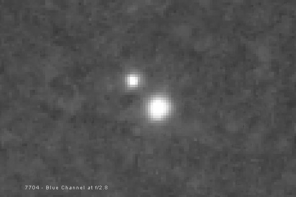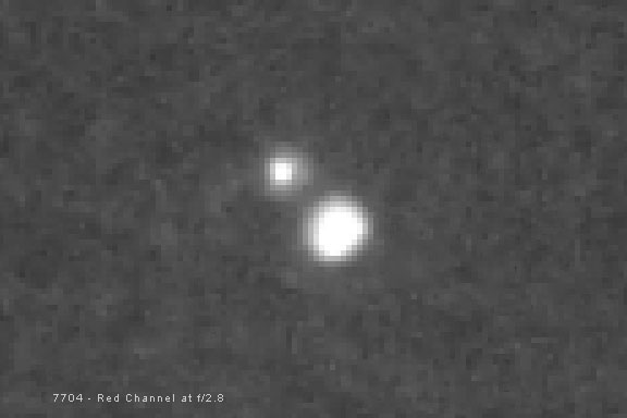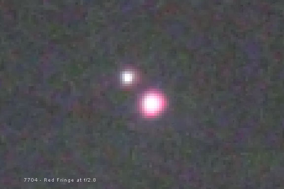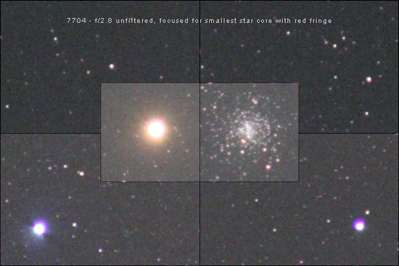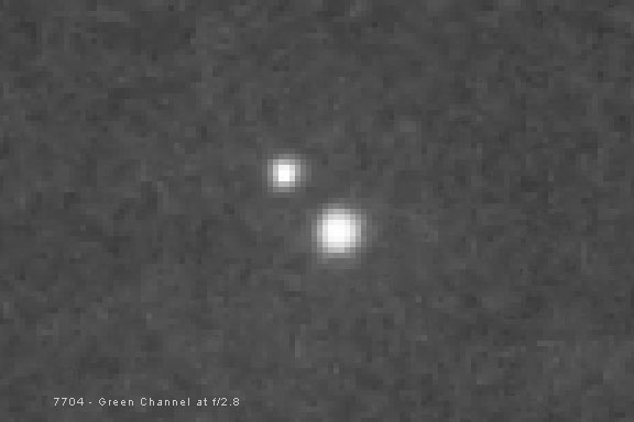 Originally I bought Fotodiox's inexpensive Nikon F to Canon EOS adapter. It cost $28. It worked fine, but the thickness of the adapter was not quite perfect, and my Nikon manual focus lenses, most of which had a hard stop at the infinity focus, all focused just a little bit before the stop, so each had to be physically focused for infinity. I have since bought Fotodiox's Nikon F to Canon EOS Pro adapter for $80. The spacing on this adapter seems perfect, so I don't have to focus any of the Nikon lenses with a hard stop at infinity. This is extremely nice and saves a lot of time under the stars, especially with wide-angle lenses, which are the hardest to focus. How does the Nikkor 180mm f/2.8 ED AI-S perform for long-exposure deep-sky astrophotography? Let's take a look. Where is the Best Focus? Unlike other short focal length manual-focus Nikon lenses, the Nikkor 180mm ED AI-S lens focuses past infinity by design. This is done because longer focal length lenses will focus at a slightly different critical focus point for infinity with changes in temperature. So, I do have to manually focus this lens when I use it for astrophotography. This is not a big deal with Live View focus, and I would have to refocus anyway when an in-camera filter is used. However, on my modified camera, the point of best apparent visual focus, where the red, green and blue colors are at the best average focus and there are no color halos around stars, is not the actual point of best focus in terms of the size of the core of the stars in the image. The actual point of best focus is when the core of the star is smallest but has a red / magenta halo around it. This can be seen in Comparison 1 below. Notice in particular how much sharper the stars in globular cluster M4 are when the lens is focused so they have slight red / magenta halos. This is because different wavelengths, or colors of light, focus at different points in a refractive optical system. Complex lens designs and exotic glass help with this problem, but usually cannot eliminate it completely, especially when a lens is used wide open at its maximum aperture. This is also made worse because my modified digital camera sensor is very sensitive to the long red wavelengths which are normally filtered out. This image shows crops from the four corners and center of a modified Canon 1000D (Digital Rebel XS) with an APS-C sized CMOS sensor at 100 percent enlargement. Brilliant red-giant star Antares and globular cluster M4 are in the center of the frame. Refractors and camera lenses, with glass lens elements, focus light by bending it when the light passes through the glass. Unfortunately, different wavelengths bend a different amount. This means that different wavelengths focus in a different spot. Optical designers can improve on this problem by using multiple glass elements with different indexes of refraction that bend colors differently and try to make them all focus in the same place. This is where ED, or extra-low dispersion, glass is extremely helpful. Lens and telescope designers are usually fairly successful at focusing most of the visual wavelengths at the same place. But for the short blue wavelengths, and longer far red wavelengths, this is more of a problem. In most inexpensive refractors, it is blue light that is most troublesome. But in a camera that is modified for enhanced red sensitivity to record the red hydrogen-alpha light of emission nebulae, focusing red light at the same place as the rest of the visual spectrum can be a problem also. Most modern DSLR cameras have a long-wavelength filter built in that reduces this problem. But a modified camera, like mine, has this filter replaced with one that passes the longer red wavelengths. Unfortunately, these red wavelengths don't come to focus at the same point as the rest of the visual spectrum. Likewise for short blue wavelengths. When a lens is focused for green light in the middle of the visual spectrum where our eye is most sensitive, the out-of-focus blue light combines with the out-of-focus red light to create a red / magenta halo around stars. In Comparison 2 below, we can see the different star sizes caused by this problem in the red channel, which records the red wavelengths, and the blue channel, which records the blue wavelengths. The red channel and the blue channel are both out of focus when the green channel is in focus. Because of the camera's enhanced red sensitivity, the red channel is even more out of focus than the blue channel. Remember that a color image is made up of red, green and blue channels that combine to produce full color. Star sizes in the red / magenta, green and blue channels at f/2.8 (enlarged 500%). The extent of this problem depends on how well corrected the lens is, and whether the camera is modified. Using certain filters, such as light pollution filters, can also make the problem worse for astronomical photography with a modified DSLR camera. This problem is not unique to camera lenses however. It can also occur in all but the absolute best-corrected, most-expensive, apochromatic refractors. It can be partially corrected by using a minus-violet filter to filter out most of the out-of-focus blue light, but there is not much you can do for the red if you want to record the red light of emission nebulae, except use star reduction techniques in the red channel during later image processing. Stopping down the lens will also improve these color halos, but this improvement comes at the cost of light gathering ability. To focus, I examine a star at 10x magnification on the LCD on the back of the camera with Live View. The point when the star does not have a blue or red fringe around it, is not, in fact, the point of best focus. At this point, the green and blue channels are actually out of focus to about the same average as the red channel, and all of the stars are bloated. The point of best focus, when the star has the smallest core, seems to be when the star also 